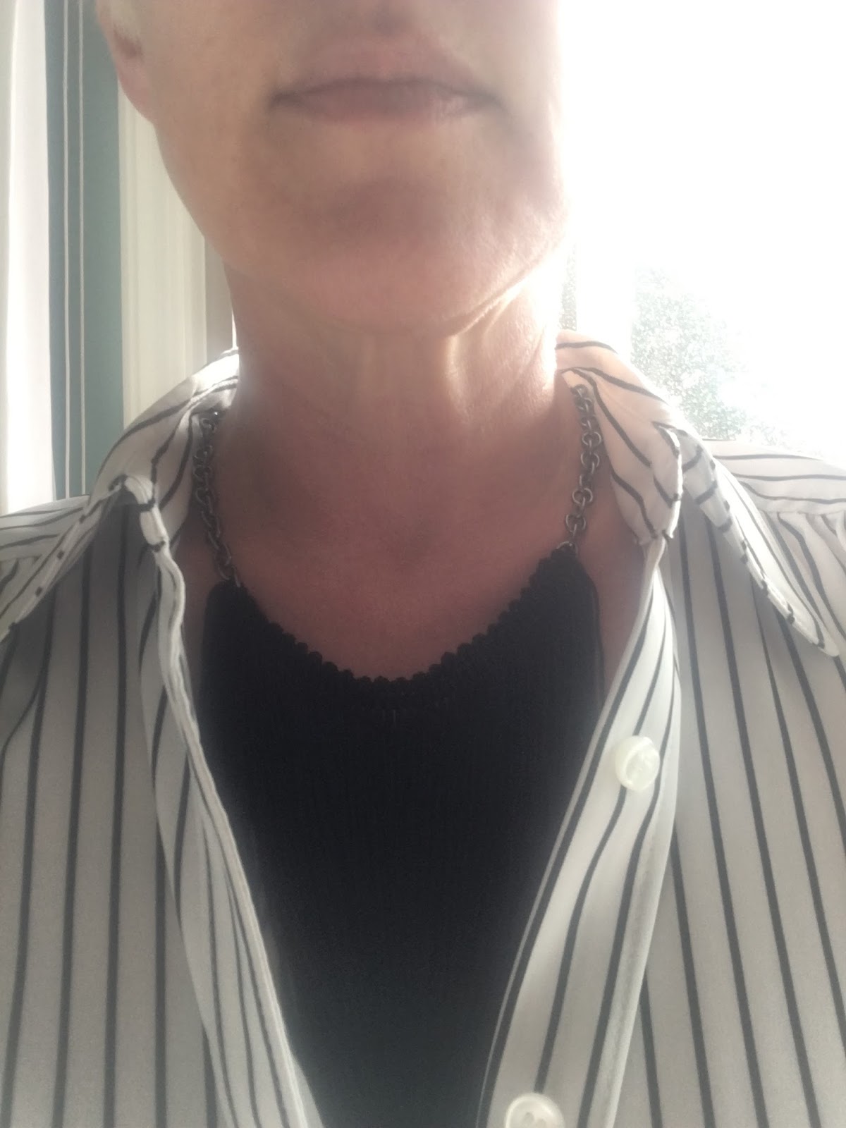 5. using about 20" of thin black ribbon put it thru both ends of the chain, put the necklace over your head and then tie the ribbon closed (I'll double knot it to make sure it stays on).