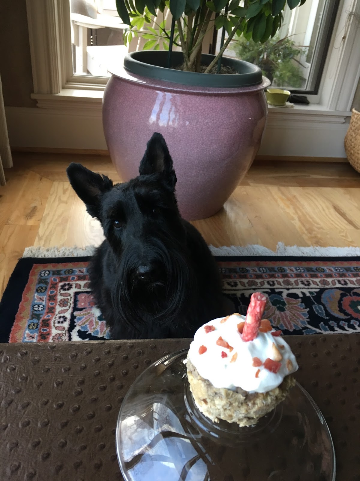 Happy Birthday to Sarge - he is 3 today.To celebrate I made him "pupcakes" - I thought he would gulp this down faster than I could take his picture, but he was quite confused actually...we don't give him people food so when I set this down he just stared at it, the only thing he really wanted was the "candle" (he recognized the crunchy stick) and when he accidentally licked the yogurt he sat down and had to think about what to do haha!!